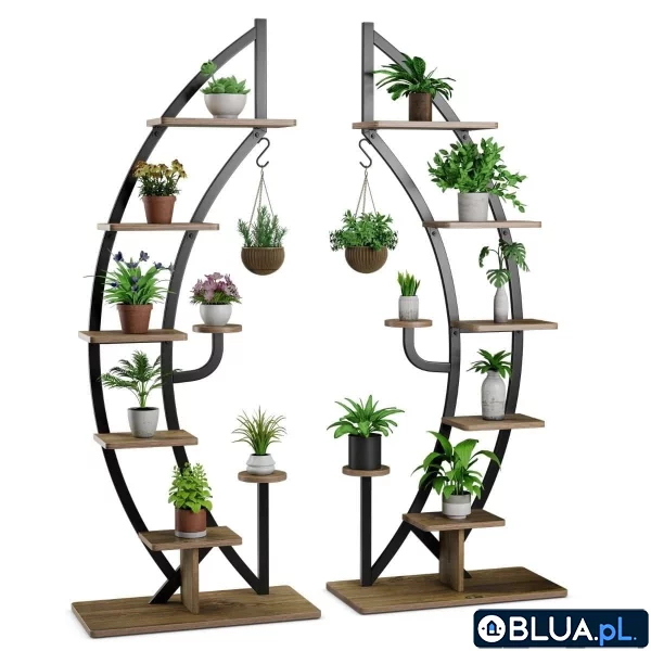 Dwie 7-poziomowe metalowe półki na kwiaty oferują dużo miejsca do eksponowania różnych roślin i dekoracji. Są zaprojektowane na wzór półksiężyca, który będzie wyróżniał się na tle się wystroju Twojego domu. Wspierane na mocnej, malowanej proszkowo stalowej ramie, która zapewnia wysoką nośność. Dzięki urządzeniu antyprzechyleniowemu nie trzeba się martwić, że się przewrócą i zniszczą ulubione rośliny. Nasze półki będzie świetnym rozwiązaniem dla Twoich roślin i dekoracjiDużo miejsca: Półki wyposażone są w 7 poziomów, zapewniając dużo miejsca do przechowywania i eksponowania dekoracji. Do całości dołączony jest górny hak, na którym można zawiesić np. koszyki.Solidna konstrukcja: Meble wspierane są przez solidną metalową konstrukcję ze stali malowanej proszkowo, która gwarantuje dużą odporność na rdzę i trwałość. Każda półka posiada udźwig do 20 kg. Duża stabilność i bezpieczeństwo: Zaprojektowane z mechanizmem antyprzechyleniowym, który można zamontować na ścianie, aby poprawić stabilność. Wysoka półka ma podkładki ochronne na spodzie, aby zapobiec poślizgowi i chronić podłogę przed zarysowaniem.Piękny design: Charakteryzują się zakrzywionym kształtem na wzór półksiężyca, który może zoptymalizować przestrzeń, dodając element elegancji do każdego pomieszczenia. Łatwa konserwacja i montaż: Wykonane z fornirowanej płyty wiórowej i MDF, są odporne na zarysowania, gładkie i wodoodporne, co ułatwia czyszczenie. Szczegółowa instrukcja i wszystkie niezbędne elementy sprawiają, że montaż jest szybki i łatwy.Cechy:Dwie 7-poziomowe półki zapewniają wystarczającą ilość miejsca do ekspozycji roślinKonstrukcja pomaga roślinom otrzymać wystarczającą ilość światła słonecznegoGórny hak pozwala na zawieszenie koszy z kwiatami lub różnych ozdóbMetalowa konstrukcja jest mocna, trwałaMechanizm antypoślizgowy zapewnia stabilność i bezpieczeństwoAntypoślizgowe nóżki na spodzie chronią podłogę przed zarysowaniamiGładka wodoodporna powierzchnia, łatwa do czyszczeniaMateriał: płyta wiórowa, płyta MDF, stalWymiary całkowite: 60 x 30 x 155 cm (szer. x gł. x wys.)Nośność każdej półki: 20 kgUdźwig górnego haka: 5 kgWaga netto: 7,5 kgZawiera:2 x metalowa półka na kwiaty1 x instrukcja