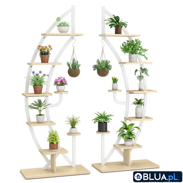 Dwie 7-poziomowe metalowe półki na kwiaty oferują dużo miejsca do eksponowania różnych roślin i dekoracji. Są zaprojektowane na wzór półksiężyca, który będzie wyróżniał się na tle wystroju Twojego domu. Wspierane na mocnej, malowanej proszkowo stalowej ramie, która zapewnia wysoką nośność. Dzięki urządzeniu antyprzechyleniowemu nie trzeba się martwić, że się przewrócą i zniszczą ulubione rośliny. Nasze półki będą świetnym rozwiązaniem dla Twoich roślin i dekoracji. Dużo miejsca: Półki wyposażone są w 7 poziomów, zapewniając dużo miejsca do przechowywania i eksponowania dekoracji. Do całości dołączony jest górny hak, na którym można zawiesić np. koszyki. Solidna konstrukcja: Meble wspierane są przez solidną metalową konstrukcję ze stali malowanej proszkowo, która gwarantuje dużą odporność na rdzę i trwałość. Każda półka posiada udźwig do 20 kg. Duża stabilność i bezpieczeństwo: Zaprojektowane z mechanizmem antyprzechyleniowym, który można zamontować na ścianie, aby poprawić stabilność. Wysoka półka ma podkładki ochronne na spodzie, aby zapobiec poślizgowi i chronić podłogę przed zarysowaniem. Piękny design: Charakteryzują się zakrzywionym kształtem na wzór półksiężyca, który może zoptymalizować przestrzeń, dodając element elegancji do każdego pomieszczenia. Łatwa konserwacja i montaż: Wykonane z fornirowanej płyty wiórowej i MDF, są odporne na zarysowania, gładkie i wodoodporne, co ułatwia czyszczenie. Szczegółowa instrukcja i wszystkie niezbędne elementy sprawiają, że montaż jest szybki i łatwy. Cechy: Dwie 7-poziomowe półki zapewniają wystarczającą ilość miejsca do ekspozycji roślin Konstrukcja pomaga roślinom otrzymać wystarczającą ilość światła słonecznego Górny hak pozwala na zawieszenie koszy z kwiatami lub różnych ozdób Metalowa konstrukcja jest mocna, trwała Mechanizm antypoślizgowy zapewnia stabilność i bezpieczeństwo Antypoślizgowe nóżki na spodzie chronią podłogę przed zarysowaniami Gładka wodoodporna powierzchnia, łatwa do czyszczenia Zawiera: 2 x metalowa półka na kwiaty 1 x instrukcja