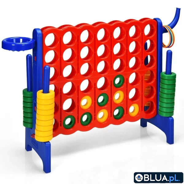 Gra Cztery w rzędzie wersja XXL dla dzieci i dorosłych Gra Cztery w rzędzie w wersji XXL to doskonały sposób na pozbycie się nudy. Sprawdzi się w domu i na świeżym powietrzu, zapewniając rozrywkę dzieciom i dorosłym. To zabawa dla całej rodziny - naucz się przewidywać kolejne ruchy i pokonaj przeciwnika dzięki przemyślanej strategii. Gra trenuje strategiczne i logiczne myślenie, a także umiejętność skupiania uwagi. Ale Cztery w rzędzie to nie wszystko! Nasz produkt pozwala bawić się w dwie dodatkowe gry: rzuty piłką do celu i rzuty obręczami. Zastosowane materiały są nietoksyczne i trwałe. Zabawka jest niezwykle lekka, a montaż zajmuje dosłownie chwilę. Jeśli szukasz idealnego prezentu, który ucieszy twoje dziecko i da ci okazję do spędzenia z nim czasu, nasz produkt będzie świetnym wyborem! Zabawa dla każdego: Nasza gra przyniesie radość nie tylko maluchom, ale także rodzicom - to dobra okazja do spędzenia czasu z dzieckiem. Zasady gry są bardzo proste i łatwe do zapamiętania także przez młodszych graczy. Jedna zabawka, potrójna radość: Połączenie gier Cztery w rzędzie, rzutów piłką do celu i rzutów obręczami to potrójna zabawa, która zajmie dzieci na długie godziny. Jeden zestaw zapewni rozrywkę kilku osobom, a każde dziecko będzie mogło wybrać swoją ulubioną grę. Najlepsze materiały: Zastosowane materiały są trwałe i bezpieczne dla dzieci, jak również odporne na działanie warunków pogodowych, dzięki czemu produkt nadaje się do użytku na dworze. Zabawa i nauka: Partię wygrywa gracz, który jako pierwszy ułoży w rzędzie 4 pierścienie tego samego koloru. Ukończenie zadania wymaga przewidywania strategii przeciwnika i planowania własnej. To doskonały trening logicznego myślenia i skupienia uwagi - umiejętności niezbędnych do prawidłowego rozwoju. Łatwy montaż: Elementy spinane na klik błyskawicznie złożysz w całość dzięki szczegółowej instrukcji. Demontaż jest równie łatwy - wystarczy rozpiąć grę, by wygodnie ją przechować. Paczka zawiera: 1 X Gra Cztery w rzędzie 21 X Zielony pierścień do gry 21 X Żółty pierścień do gry 1 X Piłka 1 X Czerwona obręcz 1 X Żółta obręcz 1 X Niebieska obręcz