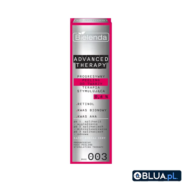 Progresywny peeling ognisty do twarzy terapia stymulująca (30 ml) z serii Bielenda Advanced Therapy przeznaczony dla każdego rodzaju cery, stymuluje odnowę i restrukturyzację skóry. Zawiera aktywne składniki takie jak retinol, który redukuje zmarszczki i rozjaśnia przebarwienia, oraz kwas bionowy, wspierający regenerację i zmniejszający widoczność drobnych zmarszczek.