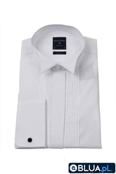 Biała koszula męska smokingowa z łamanym kołnierzykiem, krytą listwą i plisami (SLIM FIT) 38