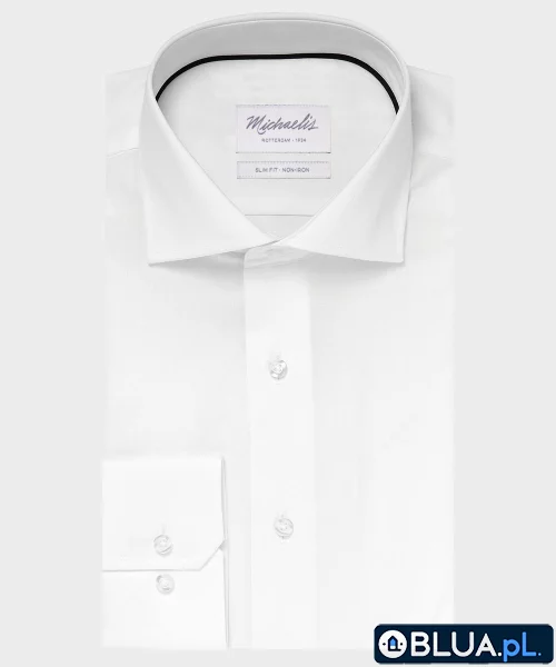 Elegancka biała koszula męska. Biała koszula na guziki z włoskim kołnierzem będzie idealnie pasować do krawata. W codziennym eleganckim ubiorze krawat stał się niezbędnym dodatkiem. Koszula ma mankiety klasyczne na dwa guziki, które dają możliwość regulacji, dzięki czemu będzie można nosić pod nimi zegarek. Koszula wizytowa Koszula została uszyta z bawełny z wykończeniem non iron. Takie wykończenie tkaniny pozwala na to aby koszula się nie gniotła przez cały dzień co jest szczególnie ważne kiedy zakładamy koszulę na ślub lub ważną wizytę. Michaelis Michaelis to holenderska marka oferująca odzież dla nowoczesnych a jednocześnie klasycznych mężczyzn. Łączy dobrą jakość z rozsądną ceną dzięki temu cieszy się dużą popularnością w krajach Beneluksu.