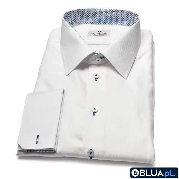 Elegancka biała koszula męska VAN THORN. Koszula jest uszyta z bawełny pochodzącej z austriackiej tkalni Getzner. Jest to tkanina typu twill czyli ma delikatny skośny splot. Wykończona metodą Top Care, dzięki czemu jest bardzo delikatna w dotyku, a przede wszystkim łatwa do prasowania i odporna na zagniecenia. Nawet po całym dniu noszenia wygląda świeżo i schludnie. Koszula ma klasyczny kołnierzyk i mankiety na spinki. Środek stójki jest kontrastowy, dziurki i guziki są przyszyte niebieskimi nićmi. Tkanina: Bawełna 100% W koszuli VAN THORN można modyfikować wymiary ponieważ koszule VAN THORN są szyte na zamówienie. Koszulę VAN THORN można zamówić z monogramem. Inicjały i kolor monogramu proszę podać w uwagach do zamówienia. Monogram haftujemy na lewym mankiecie. Jeśli chcieliby Państwo wprowadzić zmiany w koszuli, np. mankiety na spinki lub kieszonkę to jest to możliwe - prosimy o informację w uwagach do zamówienia.