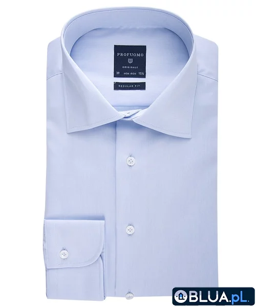 Elegancka błękitna klasyczna koszula męska (Normal Fit) z półwłoskim kołnierzykiem i mankietami na guziki. Uszyta z bawełny w 100% z wykończeniem non iron. Guziki przyszyte w tzw kurzą stopkę. Koszula uszyta jest z klasycznej lekkiej tkaniny o splocie fine twill. Jest gładka zwarta tkanina. Koszule męskie Profuomo to typowy włoski styl i dbałość o każdy detal wykończenia koszuli. Idealna jako elegancka koszula biznesowa lub wizytowa.