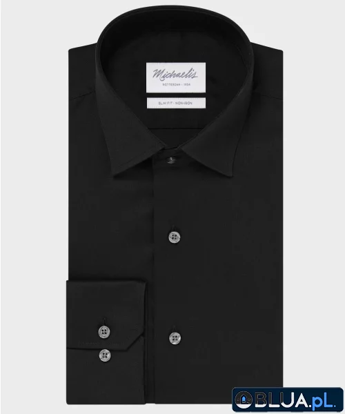 Elegancka czarna koszula męska. Czarna koszula na guziki z klasycznym kołnierzem będzie idealnie pasować zarówno do krawata jak i do muszki. Koszula ma mankiety klasyczne na jeden guziki, które umożliwiają założenie pod nimi zegarka. Koszula wizytowa Koszula ta nie powinna być noszona bez krawata lub muchy. Koszula została uszyta z bawełny z wykończeniem non iron. Takie wykończenie tkaniny pozwala na to aby koszula się nie gniotła przez cały dzień co jest szczególnie ważne kiedy zakładamy koszulę na uroczystości lub ważną wizytę. Michaelis Michaelis to holenderska marka oferująca odzież dla nowoczesnych a jednocześnie klasycznych mężczyzn. Łączy dobrą jakość z rozsądną ceną dzięki temu cieszy się dużą popularnością w krajach Beneluksu.
