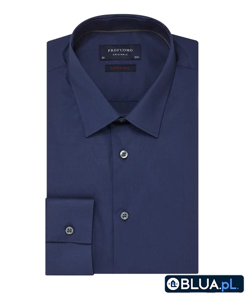 Elegancka granatowa koszula męska bawełniana typu SUPER SLIM FIT, Stretch Koszule Profuomo to dbałość o jakość szycia i detale wykończenia dlatego między innymi guziki koszuli są szyte w tzw. kurzą stopkę Elegancki kołnierzyk typu pół-włoskiego, mankiet prosty zapinany na 1 guzik. Ten model może być wykorzystany zarówno na uroczystościach jak i codziennej pracy. Koszula z tak wysokim stopniem dopasowania będzie doskonała dla każdej osoby chcącej wyeksponować swoją sylwetkę. Podczas wybierania odpowiedniego rozmiaru istotne jest aby przednia listwa nie rozchodziła się podczas siadania. Łatwa w prasowaniu dzięki wykończeniu easy iron Materiał 97% bawełna, 3% elastan