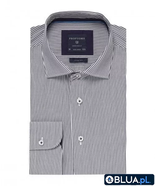 Biała koszula Profuomo Originale Slim Fit w cienkie granatowe prążki. Koszula została uszyta z najlepszej jakości bawełny, wykończona metodą non-iron, która bardzo ułatwia jej prasowanie i zachowuje świeży wygląd koszuli nawet po całym dniu chodzenia w niej. Koszula ma półwłoski kołnierzyk i mankiety zapinane na guziki. Guziki koszuli są białe z perłowym refleksem. Białą koszula w połączeniu z granatowym garniturem tworzy klasyczny biznesowy strój. Będzie również ładnie wyglądać w mniej formalnym zestawieniu, na przykład ze spodniami typu chino. Jest to krój Slim Fit, który ładnie dopasowuje się do sylwetki. Szczegóły dotyczące wymiarów można znaleźć w zakładce "Wymiary i dopasowanie", która znajduje się poniżej.