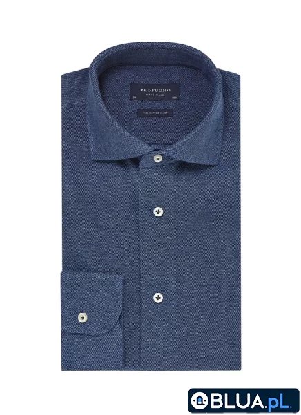 Elegancka niebieska koszula męska dzianinowa typu SLIM FIT, Koszula męska z dzianiny w kolorze jeansu z kołnierzykiem typu włoskiego czyli rozłożystym, mankiet zaokrąglony zapinany na 1 guzik. Koszule Profuomo to dbałość o jakość szycia i detale wykończenia dlatego między innymi guziki koszuli są szyte w tzw. kurzą stopkę Materiał 100% bawełna Tkanina jest bardzo przyjemna w dotyku