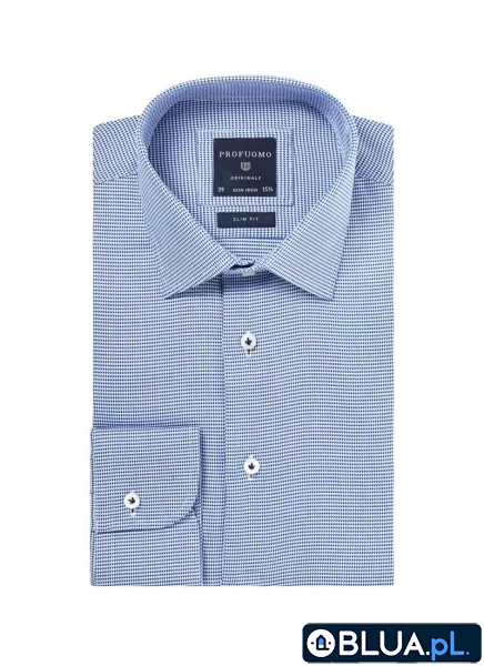 Niebieska koszula męska taliowana we wzór, Slim Fit z włoskim kołnierzykiem i mankietami na guziki. Uszyta z bawełny w 100% z wykończeniem non iron. Guziki przyszyte w tzw kurzą stopkę. Idealna jako elegancka koszula wizytowa lub biznesowa.
