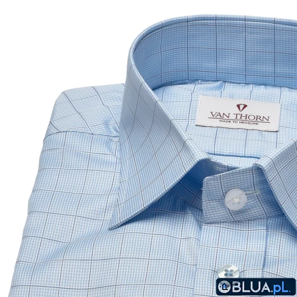 Niebieska koszula VAN THORN w kratę z kołnierzykiem półwłoskim i mankietem na spinki to pewny i sprawdzony wybór do garnituru, ale też mniej formalnych zestawów. Koszulę oprócz pięknej kraty widocznej z daleka charakteryzuje również drobny wzór zauważalny z mniejszej odległości. Niebieska koszula VAN THORN w kratę dzięki swojemu krojowi pasuje do wielu stylizacji. Ponadto bawełna użyta do jej uszycia zapewnia najwyższy komfort użytkowania. Klientom zamawiającym koszule VAN THORN dajemy możliwość zamiany rozmiarów, mankietów, kołnierzy i guzików w cenie.