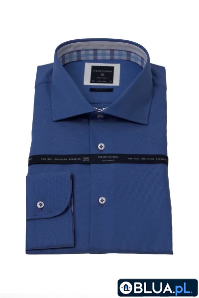 Modna niebieska koszula męska taliowana Slim Fit z włoskim kołnierzykiem i mankietami na guziki. Wewnątrz stójki kołnierza i mankietów są wszyte kontrasty białe i w niebieską kratę. Koszula ma białe guziki przyszyte nićmi w kolorze koszuli. Jest to koszula z linii Profuomo Originale Skład: bawełna 100%. Ta elegancka koszula jest uszyta z bawełny typu fil a fil z wykończeniem non iron co powoduje, że koszula mniej się gniecie oraz znacząco skraca czas prasowania. Eleganckie koszule Profuomo to typowy włoski styl i dbałość o każdy detal wykończenia koszuli. Idealna jako koszula biznesowa i casual. Szczegóły dotyczące wymiarów można znaleźć w zakładce "Wymiary i dopasowanie", która znajduje się poniżej.