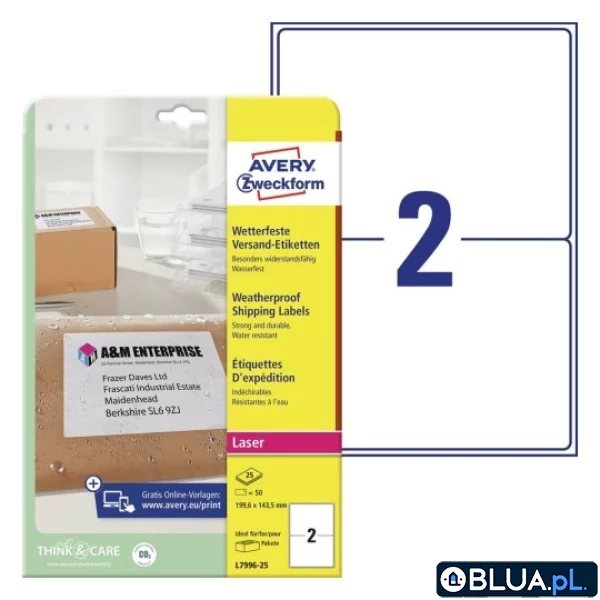 ETYKIETA A4 199,6X143,5 AVERY ZWECKFORM BIAŁA WYSYŁKOWA ODPORNA NA ZMIANY POGODOWE 25 ARK.