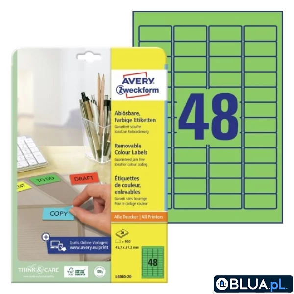 ETYKIETA A4 45,7X21,2 USUWALNE ZIELONE AVERY ZWECKFORM 20ARK