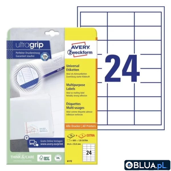 Avery Zweckform 6172 Etykiety uniwersalne posiadają unikalną i nowoczesną technologię UltraGrip: trójwymiarowe paski z tyłu arkusza gwarantują równomierne pobieranie i prowadzenie arkusza w drukarce.
