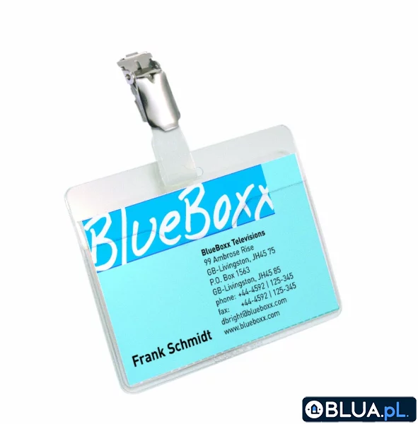 Do dowodów lub kart identyfikacyjnych. Z mocno przezroczystej twardej folii. Z obrotowym klipsem umożliwiającym pionowe zaczepienie. Kieszeń otwarta od góry umożliwia szybkie wyciąganie dowodu bez wyciągania klipsa. Z etykietami do zadrukowania.