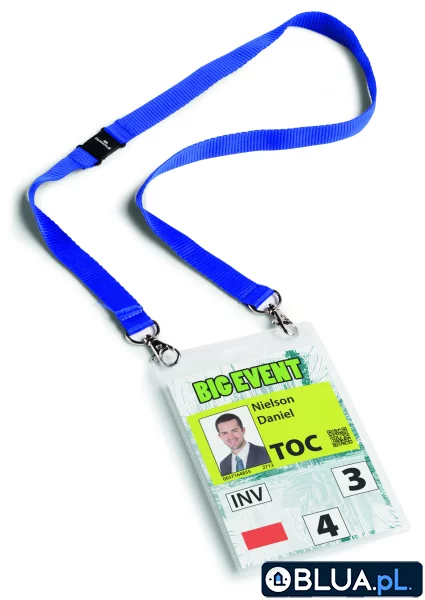 Identyfikator z dużą powierzchnią. Otwarcie od góry dla szybkiej wymiany wkładu. W zestawie z taśmą tekstylną o szerokości 20 mm zakończoną dwoma zaczepami i z zamkiem wypinającym w razie silnego szarpnięcia. Dwa otwory w identyfikatorze gwarantują utrzymanie go w odpowiedniej pozycji. Z dodatkową kieszenią na wizytówki na tylnej stronie identyfikatora.