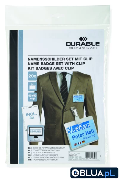 Zestaw zawierający 20 identyfikatorów z klipsem, arkusze z etykietami, które można opisać przy pomocy bezpłatnego programu DURAPRINT®, dostępnego na stronie www.duraprint.pl.
