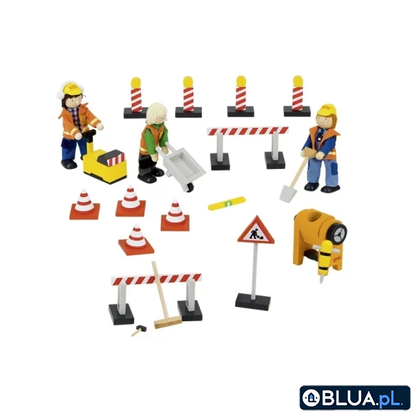 m.in.: znaki drogowe, taczka, betoniarka, młotek, czy łopata