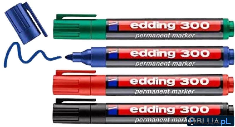 Marker permanentny Edding 300 z okrągłą końcówką, szerokość linii wynosi 1,5-3 mm. Trwały, bezwonny tusz, który szybko schnie i nie rozmazuje się. Odporny na działanie czynników zewnętrznych tj. światła oraz wodoodporny. Przeznaczony jest do pisania na papierze, kartonie, szkle, tworzywie sztucznym czy też metalu. Marker permanentny posiada praktyczny klips, który można mocować do ubrań, książek. Można także wypełnić marker tuszem uzupełniającym.