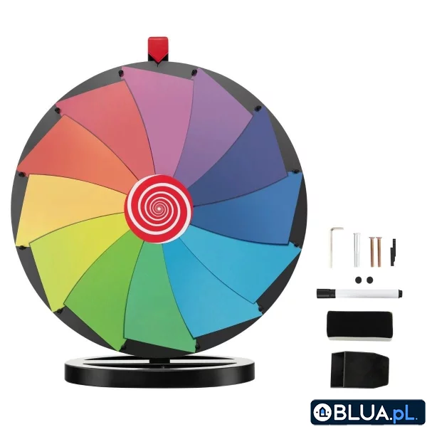 Dzięki zmywalnemu markerowi i gumce możesz dostosować panele do swoich potrzeb. Czerwony wskaźnik na górze wydaje dźwięk klikania podczas obracania kołem. Ponadto dodatkowa skrytka zapewnia więcej miejsca do przechowywania. Niewielka waga 3 kg i kompaktowy rozmiar ułatwiają transport. Konfiguracja koła: Koło fortuny posiada zmywalny marker do pisania oraz gumkę do usuwania napisów Trwała i stabilna podstawa: solidna plastikowa podstawa koła fortuny zapewnia wytrzymałość a antypoślizgowe przyssawki poprawiają stabilność i chronią przed uszkodzeniami. Dodatkowa tylna komora: koło fortuny ma również ukrytą komorę, w której można przechowywać marker lub gumkę. Dzięki wspomnianej skrytce wszystkie potrzebne rzeczy można mieć zawsze pod ręką. Zabawne i ekscytujące dźwięki: czerwony wskaźnik na górze wydaje dźwięk kliknięcia, gdy koło nagrody jest obracane, aby przyciągnąć uwagę użytkowników. Łatwy montaż i demontaż: dzięki prostej konstrukcji i wszystkim niezbędnym akcesoriom, nasze koło nagród można łatwo i szybko złożyć. Gdy nie jest używane, można je bez wysiłku zdemontować, aby zwolnić miejsce. Cechy: Gładka powierzchnia jest łatwa do pisania i wymazywania Trwała, solidna plastikowa konstrukcja zapewnia stabilność na różnych powierzchniach Tylna komora może pomieścić różne przedmioty Czerwony górny wskaźnik i solidne kołki wydają ekscytujące dźwięki klikania, gdy się zderzają Magnetyczne urządzenie do zabezpieczenia środka Wszechstronna i funkcjonalna konstrukcja sprawia, że idealnie nadaje się na wszelkiego rodzaju wydarzenia Łatwa powierzchnia do czyszczenia Niska waga (3 kg) ułatwia transport Łatwy montaż i demontaż Zestaw zawiera: 1 x koło fortuny 1 x instrukcja