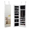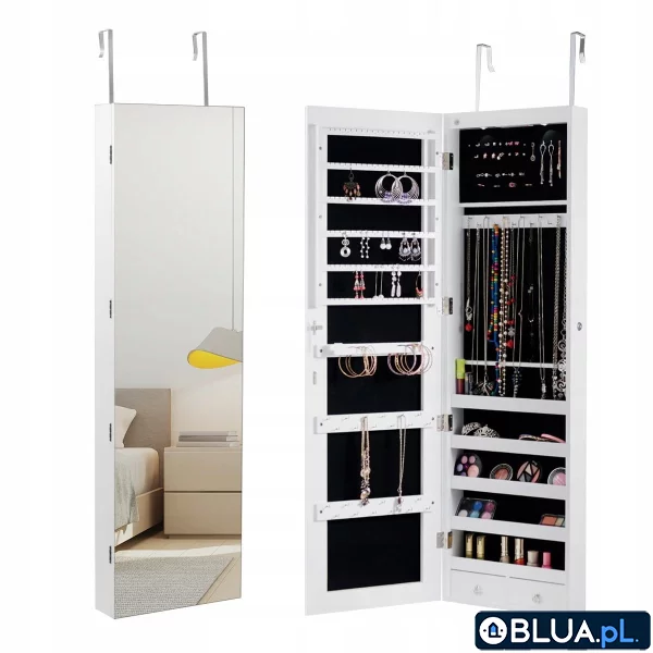 Szafka na biżuterię i akcesoria z lustrem Profesjonalny organizer z podświetleniem LED Dużo przestrzeni do przechowywania - szafka posiada 6 wyściełanych półek, 1 pręt, 36 haczyków, 98 miejsc na pierścionki, 5 półek oraz 2 dolne szuflady Automatyczne włączanie świateł - funkcja automatycznego włączania diod LED przy otwarciu sprawia, że znalezienie odpowiedniej biżuterii jest jeszcze łatwiejsze Zamykana na zamek - dodatkowy zamek chroni Twoją biżuterię przed dostępem innych osób Szklane lustro - pełnowymiarowe lustro z prawdziwego szkła daje wyraźny obraz i pozwala uniknąć efektu zniekształconego odbicia Powłoka odporna na wilgoć i korozję - szafka została wykonana z wysokiej jakości płyt, dzięki czemu jest bardzo solidna i trwała. Powłoka proszkowa na powierzchni jest odporna na wilgoć i korozję. Dodatkowo ochronna, aksamitna podszewka w szafce na biżuterię chroni ją przed zadrapaniami i porysowaniami, a także utlenianiem. Zaczepy do montażu - do powieszenia szafki na drzwiach lub ścianie służą 2 zaczepy. Są kompatybilne z różnymi rodzajami drzwi i ich nie powodują ich uszkodzenia W zestawie Szafka na biżuterię z lustrem * Baterie AA nie wchodzą w skład zestawu