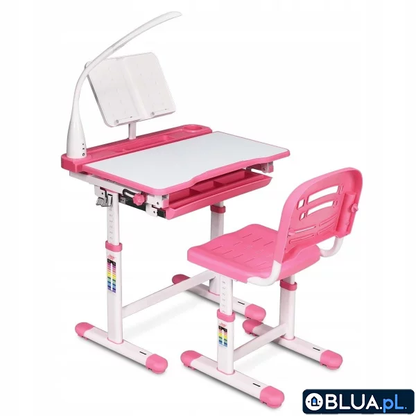 Dziecięcy stolik kreślarski z krzesełkiem Regulowany zestaw który rośnie wraz z Twoim dzieckiem! Możliwość regulacji - możliwość regulacji wysokości biurka w zakresie od 54 do 76 centymetrów oraz regulacji wysokości krzesła od 32 do 44 centymetrów sprawia, że zestaw rośnie wraz z dzieckiem. Dzięki funkcji zmiany kąta nachylenia blatu od 0 do 40°, można z łatwością dopasować stół do siebie i konkretnej aktywności Przestrzeń do przechowywania - szuflada znajdująca się pod blatem, dodatkowe przegródki, nastawka na książkę oraz haczyk na plecak zapewniają dużą przestrzeń do przechowywania Dodatkowe oświetlenie - do zestawu dołączona została lampka z regulacją poziomu jasności oraz możliwością zmiany kąta świecenia Stabilna bezpieczna konstrukcja - solidna konstrukcja z wysokiej jakości metalowej ramy, płyty MDF oraz tworzywa sztucznego zapewnia trwałość na lata. Lekko zaokrąglone krawędzie gwarantują bezpieczeństwo Antypoślizgowe nakładki - duża antypoślizgowa osłona u dołu każdej z nóżek zapobiega przesuwaniu się zestawu Łatwy montaż - zestaw jest bardzo prosty w montażu. Wszystkie elementy potrzebne do instalacji zostały dołączone do zestawu