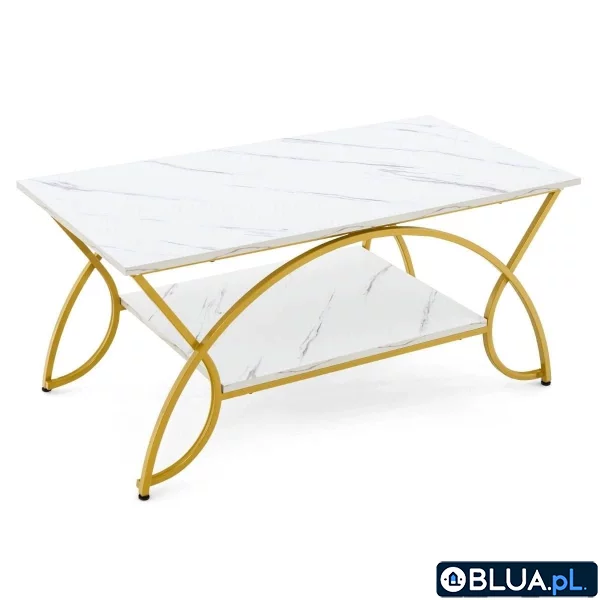Nowoczesny 2-poziomowy stolik kawowy z blatem imitującym marmur Jego estetyczny design wpasuje się do każdego stylu wnętrza. Kompozycja smukłych, zakrzywionych oraz prostych linii ramy nie tylko nadają mu wykwintnego wykończenia, ale także zapewniają znakomitą stabilność. Przestronny blat oferuje dużo użytecznego miejsca i sprawia, że stół stanowi funkcjonalny dodatek do każdego salonu. Doskonale sprawdzi się do serwowania jedzenia, lub ekspozycji ulubionych ozdób, kwiatów i innych dekoracji. Nowoczesny, stylowy stolik kawowy: Nasz stolik wyposażony został w biały blat ze sztucznego marmuru, który nadaje mu szykownego wyglądu. W połączeniu z elegancką złotą ramą idealnie wpasowuje się on do mebli pokojowych o najróżniejszych stylach wykonania, nadając otoczeniu nowoczesnego stylu. Solidna i stabilna konstrukcja: Solidna metalowa rama z eleganckim złotym wykończeniem jest bardzo wytrzymała, odporna na rdzę i trwała. Łukowate elementy tworzą stabilną i wytrzymałą konstrukcję oraz zapewniają doskonałą wytrzymałość na obciążenia wynoszącą 70 kg (Maksymalny udźwig powierzchni blatu wynosi 50 kg). 2-poziomowy design: Oprócz atrakcyjnego wyglądu, stolik wyposażony został również w funkcjonalny 2-piętrowy design do ekspozycji dekoracji i przechowywania przedmiotów codziennego użytku. Przestronny blat o wymiarach 100 cm x 50 cm (dł x szer) może służyć do ustawienia filiżanek do kawy, laptopów i wazonów. Dolna półka nadaje się do przechowywania książek i innych drobiazgów. Przemyślane szczegóły: Metalowy szkielet wyposażony jest w plastikowe uszczelki i regulowane nakładki na nóżkach, które zapobiegają przypadkowym zarysowaniom podłogi i zwiększyć ogólną stabilność podczas użytkowania. Dolna półka została jest na wysokości 15 cm od podłoża, co ułatwia odkurzanie i utrzymanie przestrzeni w estetycznym porządku. Prosty montaż i czyszczenie: Dzięki dołączonej do zestawu szczegółowej instrukcji oraz wszystkim niezbędnym akcesoriom montaż stolika jest prosty i szybki. Wszystkie części zostały oznaczone, co dodatkowo ułatwia cały proces. Ponadto jego gładka powierzchnia ułatwia utrzymanie czystości, a wszelkie zabrudzenia na blacie można łatwo zetrzeć wilgotną ściereczką. W zestawie: 1x nowoczesny stolik kawowy 1x instrukcja