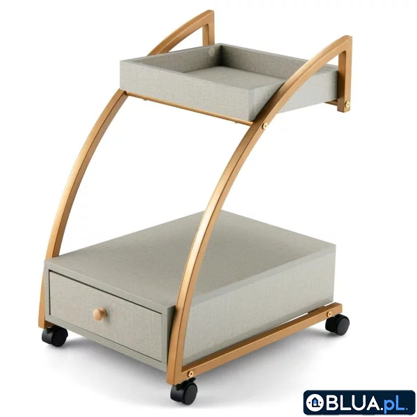 Stolik boczny na kółkach z szufladą Nasz 2-poziomowy stolik boczny posiada unikalną, łukowatą konstrukcję, która łączy ze sobą różne poziomy, w tym dolny z półką i szufladą, oraz górny z otwartą tacką. Taka budowa stolika pozwala utrzymać przedmioty w schludnie zorganizowanej i użytecznej przestrzeni. 4 obrotowe kółka umożliwiają proste przemieszczanie między różnymi miejscami aby stolik był dostępny zawsze tam gdzie tego chcesz. 2 z kółek wyposażone zostały w hamulce, które sprawiają, że całość można unieruchomić i stabilnie ustawić w dowolnym miejscu. Dzięki temu stolika można używać w różnych pomieszczeniach jako stolika nocnego, wózka z przekąskami lub stolika kawowego. Ponadto jego konstrukcja wykonana została z wytrzymałej stalowej ramy i wysokiej jakości materiału MDF, co pozwala na utrzymanie do 20 kg obciążenia. Szare elementy w połączeniu ze złotą ramą nadają stolikowi elegancki i nowoczesny styl wykonania. Dwupoziomowa konstrukcja w kształcie litery C: Kształt na wzór litery C w połączeniu z kwadratową tacką i dolną szufladą sprawia, że nasz kompaktowy stolik pozwala zaoszczędzić miejsce w pomieszczeniu. Jego wymiary całkowite wynoszą 40 cm x 50 cm x 65,5 cm. Górna taca i dolna wysuwana szuflada zapewnia dużo miejsca na przekąski, dekoracje, czasopisma i inne przedmioty. Najwyższej jakości MDF i stal: Całość wykonana została z solidnej płyty MDF i lakierowanych stalowych rurek, co zapewnia maksymalny udźwig do 20 kg. Gładka powierzchnia z pyty MDF jest trwała i prosta do utrzymania w czystości. Wzmocniona, stalowa rama zapewnia najlepszą wytrzymałość oraz długą żywotność. 4 obrotowe kółka: Na spodzie stolika umieszczone zostały cztery uniwersalne, pełnoobrotowe kółka. Dwa z nich wyposażone są w hamulce, które umożliwiają utrzymanie mobilnego wózka w stałej pozycji nawet na nierównym podłożu. Umożliwiają one również łatwe i swobodne przemieszczanie między pokojami. Zdejmowana górna tacka: Po odkręceniu śrub pod tacą, można ją zdjąć i wykorzystać do serwowania napojów. Dzięki temu całość można przekształcić w stolik obrotowy, stolik kawowy lub stolik nocny, który najlepiej sprawdzi się w salonie lub sypialni. Elegancki dekoracyjny design: Dzięki dołączonej do zestawu szczegółowej instrukcji oraz wszystkim niezbędnym akcesoriom montaż wózka jest prosty i szybki. Połączenie kremowej szarości i złotych kolorów zapewnia minimalistyczny, lecz szykowny wygląd. Zakrzywiona stalowa rama sprawia, że powierzchnia stolika jest bezpieczna w użytkowaniu. Całość pełni również role doskonałej dekoracji w każdym pomieszczeniu. Zawiera: 1 x Mobilny stolik boczny 1 x Instrukcja