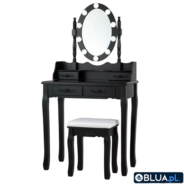Toaletka z owalnym lustrem 360° z oświetleniem LED i taboretem Cechą szczególną tego modelu toaletki jest 10 nienagrzewających się żarówek LED zapewniających miękkie światło, którego intensywność możesz regulować według własnego uznania. Szeroki blat i 4 szuflady gwarantują miejsce na kosmetyki, biżuterię i inne potrzebne akcesoria, a miękki taboret zapewnia komfort w trakcie siedzenia. Solidna konstrukcja z płyt MDF i drewna sosnowego zapewnia wytrzymałość i stabilność. Ponadto doskonałe wykonanie i elegancki design sprawiają, że zestaw prezentuje się pięknie w każdym wnętrzu. Wysokiej jakości materiały i solidna konstrukcja: Toaletka i taboret wykonane są z płyt MDF, dzięki czemu są bardzo wytrzymałe i łatwe do czyszczenia. Nogi z litego drewna stanowią doskonałe wsparcie, a antypoślizgowe podkładki zapewniają dodatkową stabilność. Maksymalne obciążenie taboretu wynosi 100 kg. Owalne lustro z oświetleniem LED: Wokół krawędzi lustra znajduje się 10 żarówek LED. Intensywność światła można regulować za pomocą przycisku. Dzięki funkcji pamięci ostatniego ustawienia po ponownym włączeniu jasność będzie taka sama jak przed wyłączeniem. Ponadto w zestawie znajduje się jedna zapasowa żarówka. Przestronny blat i 4 szuflady: Toaletka posiada 2 większe i 2 mniejsze szuflady, które ułatwią organizację kosmetyków, biżuterii i innych akcesoriów. Szeroki blat pomieści dekoracje i rzeczy, które chcesz mieć zawsze pod ręką. Komfort siedzenia: Dzięki sprężystej gąbce o dużej gęstości, taboret jest bardzo wygodny i odporny na odkształcenia. Biała ozdobiona wzorami poszewka dodaje elegancji całemu zestawowi. Taboret może być również używany samodzielnie jako stołek do pianina, podnóżek lub siedzenie do zakładania butów. Podwójne zastosowanie: Po odłączeniu górnej części z lustrem i szufladkami stół może służyć jako biurko lub stolik komputerowy, przy którym można się uczyć, czytać lub pracować. Dzięki nowoczesnemu stylowi dobrze komponuje się z istniejącym wyposażeniem i będzie doskonałym dodatkiem do każdego wnętrza. Opakowanie zawiera: 1 x toaletka z oświetleniem 1 x taboret 1 x instrukcja