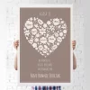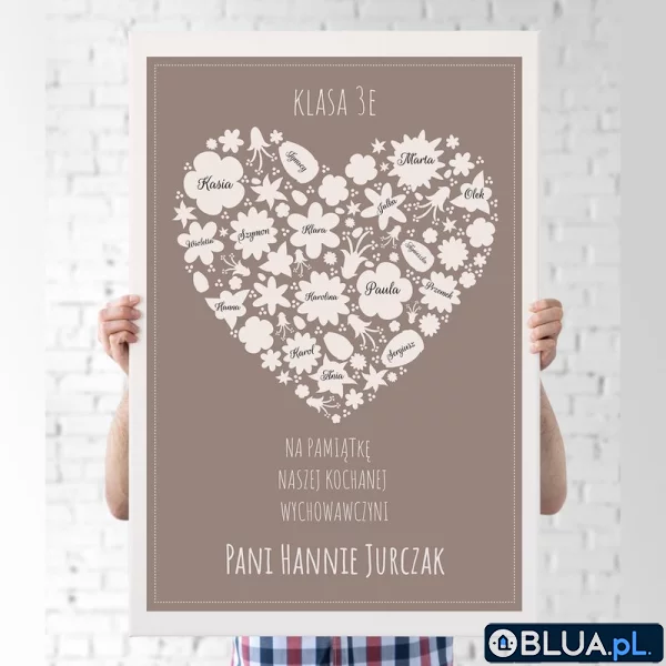 Projekt opiera się na motywie serca, utworzonego z małych, białych kwiatków, na których można umieścić imiona uczniów. Serce znajduje się na tle w kolorze mokki. Nad i pod grafiką można dodać spersonalizowany napis, który oddaje charakter uroczystości. Cała kompozycja tworzy bardzo elegancką pamiątkę, która z pewnością przywoła niezapomniane chwile z życia klasy.