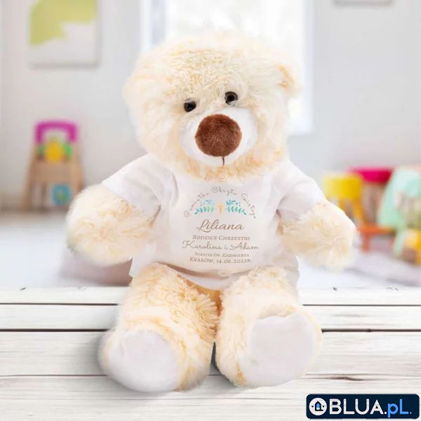 Proponujemy państwu pięknego pluszowego misia, który będzie świetnym pomysłem na prezent z okazji przyjęcia chrztu świętego. Uroczy, miły w dotyku miś stanie się ulubioną prztulanką maluszka i jego najlepszym przyjacielem. Dzięki ulubionemu misiowi dziecko będzie się czuło miło i bezpiecznie, dzięki czemu będzie spokojniejsze, a jego sen będzie długi i nieprzerwany, co z pewnością docenią rodzice. Na koszulce misia umieszczamy personalizowany nadruk w postaci krzyża, imienia dziecka i rodziców chrzestnych i napisu Pamiątka Chrztu Świętego, dzięki czemu prezent stanie się wyjątkową i niepowtarzalną pamiątką.