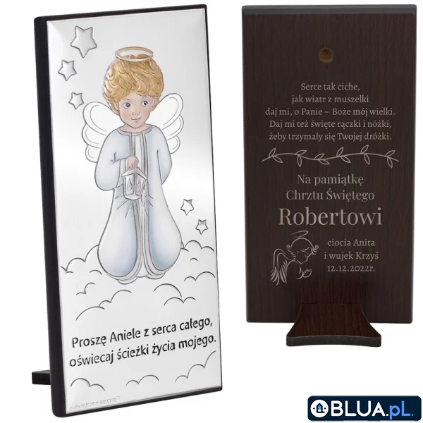 Proponujemy państwu wyjątkową pamiątkę chrztu - obrazek z płaskorzeźbą przedstawiającą anioła. Uroczy aniołek nadaje obrazkowi dziecięcego charakteru, przez co idealnie sprawdzi się na chrzest. Na obrazku widnieje napis Proszę Aniele z serca całego, oświecaj ścieżki życia mojego, dzięki któremu dziecko uczy się odmawiania modlitwy od najmłodszych lat. Przednia część produktu jest stała i nie podlega modyfikacjom. Na odwrocie wykonamy personalizowany grawerunek zgodnie z państwa projektem. Imię dziecka, życzenia, czy cytat z biblii sprawią, że prezent stanie się wyjątkową i niepowtarzalną pamiątką. Grawerunek nanosimy metodą laserową, która charakteryzuje się wyjątkową precyzją i trwałością.
