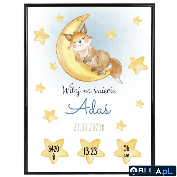 W metryczce mogą państwo umieścić wiele informacji o maluszku, takich jak imię dziecka, datę urodzenia, czy wzrost. Piękna grafika w postaci zwierzątka leżącego na księżycu wśród gwiazdek nadaje plakatowi urokliwego, dziecięcego charakteru. Dzięki prostemu i intuicyjnemu edytorowi na naszej stronie, z łatwością stworzą państwo swój projekt. Plakat umieszczamy w plastikowej ramce z płytą plexi, którą charakteryzuje wysoka przezroczystość i duża wytrzymałość na uderzenia.