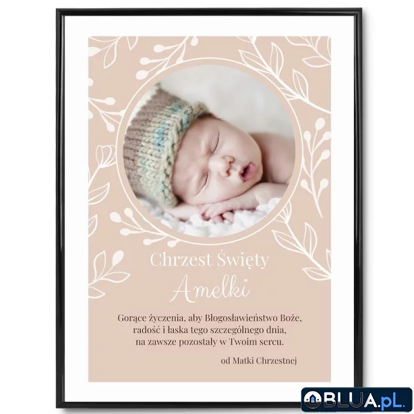 Proponujemy państwu wyjątkowy plakat, który stanie się piękną pamiątką Chrztu. Piękna grafika w postaci zdjęcia dziecka i napisu Chrzest Święty nadaje plakatowi wyjątkowego uroku. Tło utrzymane w delikatnej, różowej kolorystyce sprawia, że plakat będzie idealnym prezentem dla dziewczynki. W centralnej części plakatu znajduje się miejsce na imię dziecka, życzenia i podpis wręczającej osoby, dzięki czemu prezent będzie wyjątkowy i niepowtarzalny. Dzięki prostemu i intuicyjnemu edytorowi na naszej stronie, z łatwością stworzą państwo swój projekt. Plakat umieszczamy w plastikowej ramce z płytą plexi, którą charakteryzuje wysoka przezroczystość i duża wytrzymałość na uderzenia.