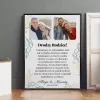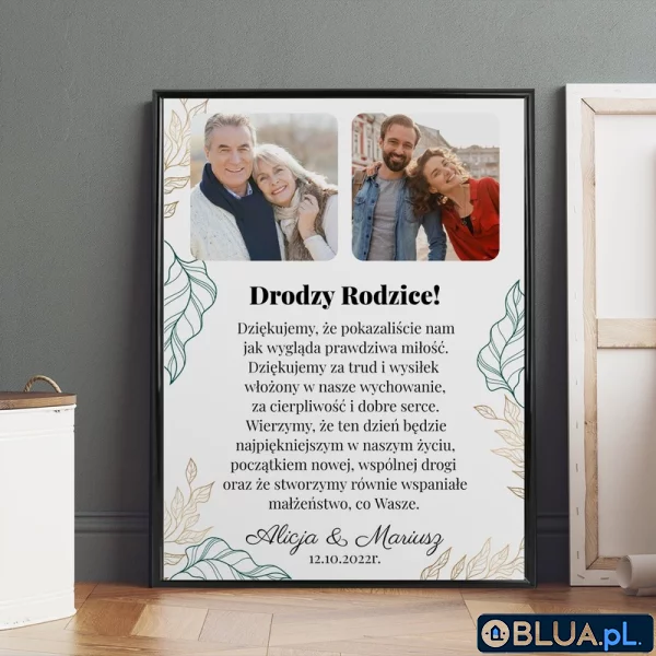 Proponujemy państwu wyjątkowy prezent na podziękowanie dla rodziców - personalizowany plakat. Ten wspaniały upominek będzie zarówno piękną, sentymentalną pamiątką jak i wyjątkowym elementem wyposażenia wnętrza, który z pewnością docenią rodzice. Plakat na podziękowanie rodzicom na ślub jest świetnym pomysłem na wyrażenie swojej wdzięczności dla tych wyjątkowych osób. Prosty i intuicyjny edytor na naszej stronie sprawi, że z łatwością stworzą państwo swój projekt. Wzór z tekstem i własnymi zdjęciami z pewnością przypadnie go gustu rodzicom.