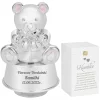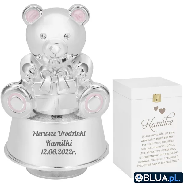 Pozytywka ze skarbonką to atrakcyjnie wykonana ozdoba, która idealnie sprawdzi się jako prezent na chrzest lub roczek dla dziewczynki. Różowe uszy i stopy misia pięknie korespondują ze srebrnym połyskiem figurki. Nostalgiczna melodia kojąco wpływa na dziecko i pomaga w usypianiu.