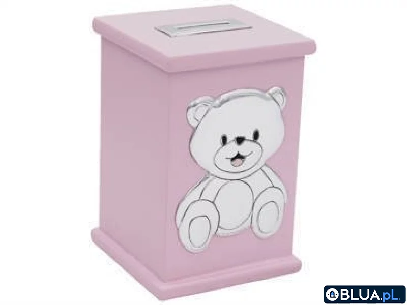 Posrebrzana skarbonka z pozytywką z misiem w kolorze różowym z indywidualną dedykacją.