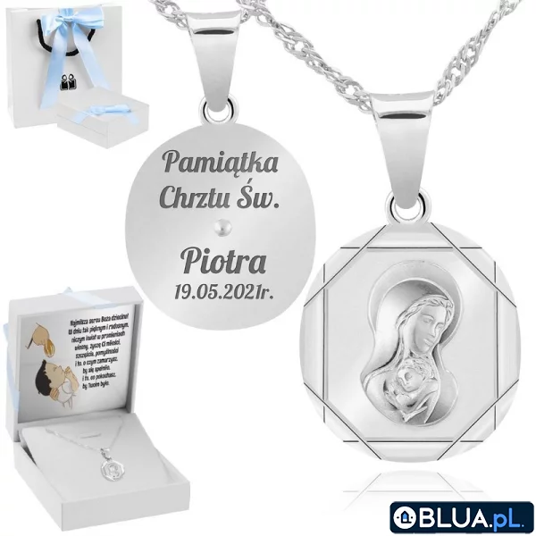 Proponujemy Państwu prześliczny medalik z wizerunkiem Matki Boskiej z indywidualnym grawerunkiem. Medalik został wykonany najwyższej jakości srebra próby 925. Świadczą o tym dołączone metki jubilerskie, oraz wybita próba, zbadana przez Polski Urząd Probierczy. Wykonany jest ręcznie z niesamowitą dbałością o detale, to nieodłączny element tak ważnej uroczystości jak Chrzest, I Komunia Święta, Bierzmowanie. To piękna pamiątka na lata. Dodatkowo upominek stanie się jeszcze bardziej spersonalizowany dzięki umieszczonemu grawerunkowi na rewersie medalika. Wyjątkowa pamiątka Chrztu Świętego, I Komunii Świętej, Bierzmowania lub innej ważnej uroczystości.