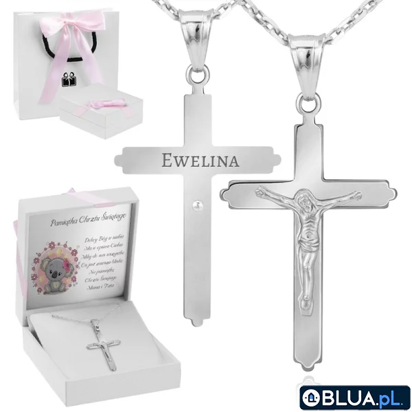Krzyżyk jest w komplecie ze srebrnym łańcuszkiem (ankier). Oba przedmioty umieścimy w pudełku z różową kokardką. W jego wnętrzu dodamy tabliczkę z osobistą dedykacją klienta. Mogą to być życzenia, słowa modlitwy, pieśni dopełnione grafiką itp. Komplet zapakujemy do torebki prezentowej ze wstążką. Tak przygotowany prezent wygląda niezwykle elegancko i robi dobre wrażenie.