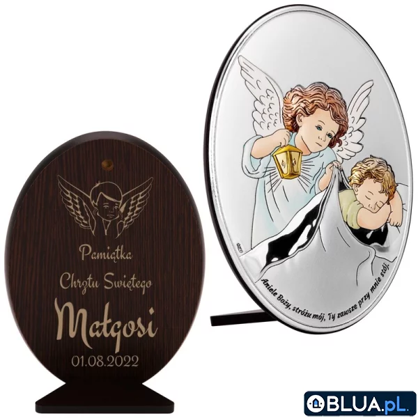 Owalny obrazek z aniołem czuwającym przy dziecku to wykonana z pietyzmem ozdoba. Stonowana kolorystyka połączona z połyskiem srebra subtelnie ozdobi każde wnętrze.