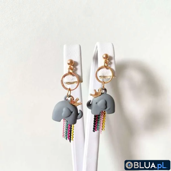 Stalowe kolczyki z kolorowymi łańcuszkami i słonikiem na gumowym sztyfcie.