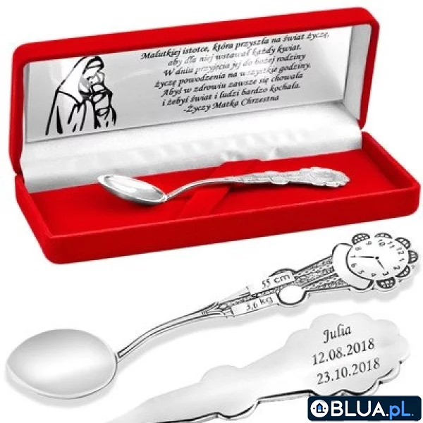 Łyżeczka srebrna na pamiątkę chrztu, narodzin dziecka + Twój Grawer na łyzeczce. Dodatkowo tabliczka z Twoją dedykacją na srebrnym lub złotym laminacie grawerskim.