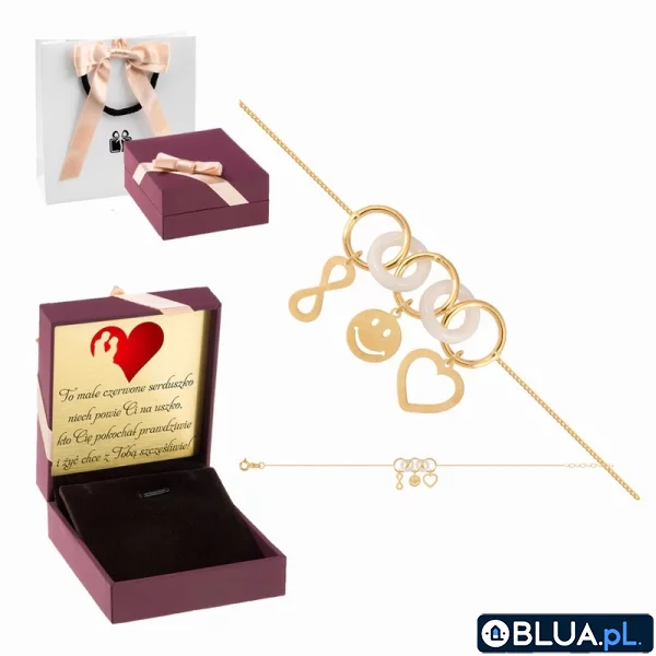 Delikatna, drobna bransoletka z ciekawymi elementami świetnie sprawdzi się dla kobiety ceniącej niestandardowe ozdoby, które świetnie sprawdzą się na co dzień. Złoto pokryte lakierem ochronnym sprawia, że bransoletka pięknie się błyszczy i będzie wyjątkowym dopełnieniem wielu stylizacji. Symbole w postaci nieskończoności, serca i emotikony nadają ozdobie niezobowiązującego, zabawnego charakteru.
