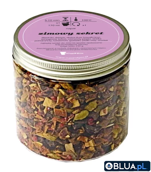 Smak: rozgrzewająca mieszanka przypraw i owocówSkładniki: daktyle, ekstra duże kawałki kiwi, winogrona, kokos, czerwony pieprz, skórka pomarańczy, kardamon, goździki, płatki róży, aromat