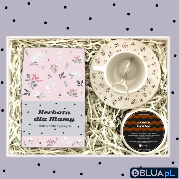 Zestaw prezentowy dla mamy Słodka Mama. Zestaw herbat sypanych 10x5/8g, kawa o smaku creme brulee 200g, kwiecista filiżanka i poręczny zaparzacz