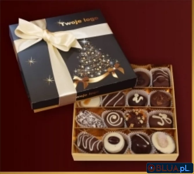 Ręcznie robione czekoladki zamknięte w świątecznej bombonierce z firmowym nadrukiem. Waga 220g.
