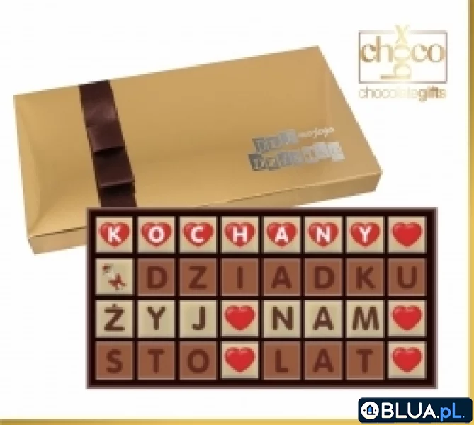 Bombonierka z tekstem wykonanym z czekoladowych kostek dla Kochanego Dziadka. Waga 288g.