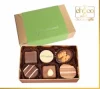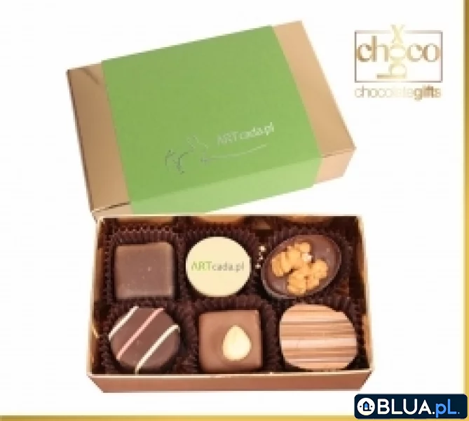 Złoty kartonik z 6 pralinkami oraz zieloną opaską. Waga 85g.