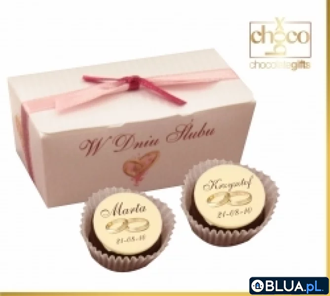 Standardowy kartonik, a w nim personalizowane czekoladki Pary Młodej. Waga 28g.