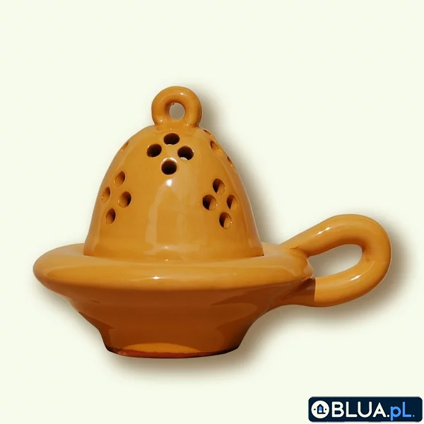 Kadzielniczka gliniana, pokryta ciemnożółtą glazurą. Dzięki dwukrotnemu wypalaniu w piecu jest odporna na temperaturę rozgrzanego węgielka. W odróżnieniu od kadzielnic metalowych, kadzielniczka ceramiczna nie rozgrzewa się w tak szybkim tempie, dzięki czemu można ją bezpiecznie przenosić. W komplecie z podstawką, w celu lepszej izolacji termicznej od podłoża.